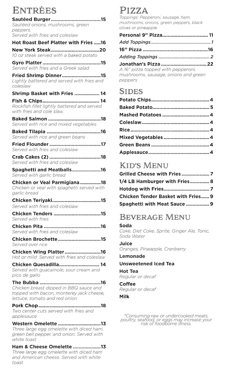 Jonathan’s also carries a quiet sense of longevity. Many who walk through its doors have woven it into their routines, returning week after week as part of their daily rhythm. It’s a space where young folks find comfort dining solo, friends gather to cheer on their favorite teams, and families appreciate the welcoming environment that offers a bit of something for everyone.